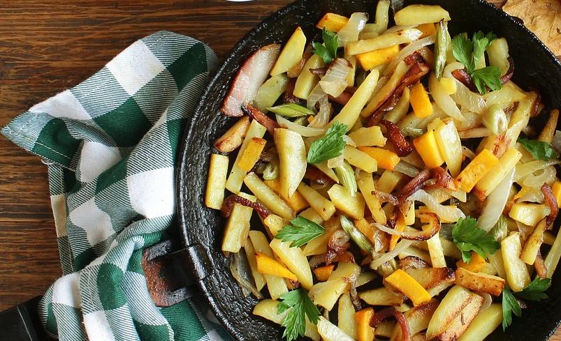 Das gebratene Gemüse aus der Pfanne nehmen und erstmal beiseite stellen. Anschließend erneut etwas Pflanzenöl erhitzen und nun die vorgekochten Kartoffelscheiben und die Süßkartoffelscheiben in die Pfanne geben und von beiden Seiten anbraten. Eventuell eine zweite Pfanne nutzen, um den Kartoffeln mehr Platz zu geben; mit Salz und Pfeffer würzen.