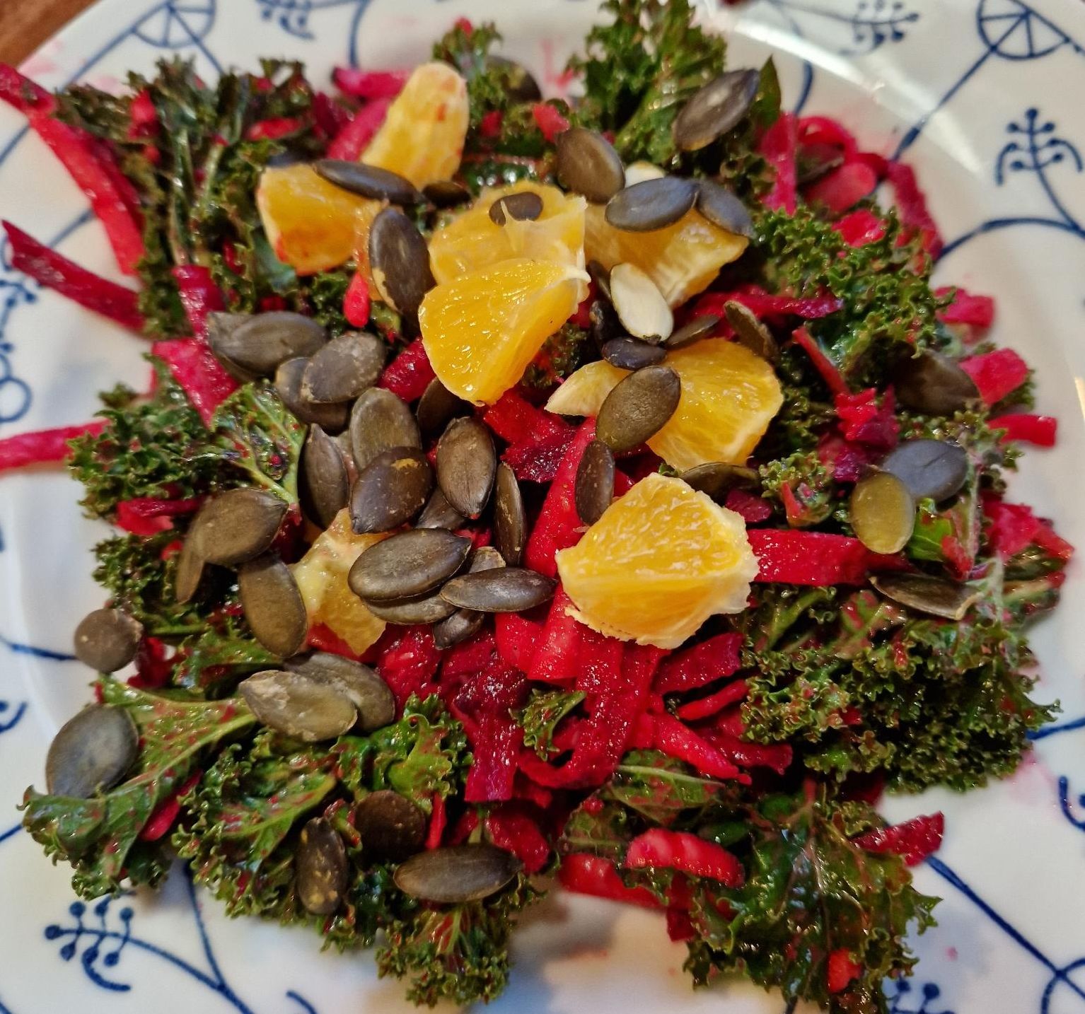 Rote Bete, Rettich und Orangen schälen. Rote Bete würfeln, Orangen filetieren und bei Bedarf klein schneiden. Rettich grob raspeln.