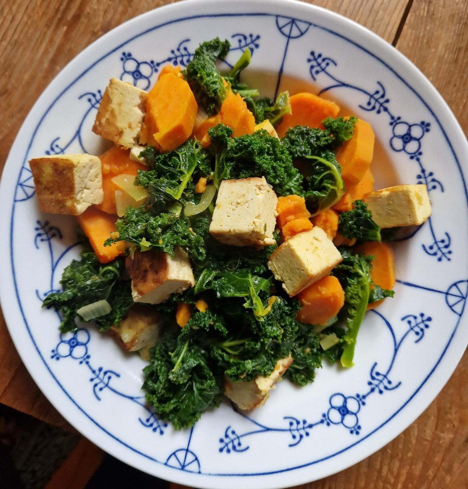 Die Süßkartoffeln und den Grünkohl hinzufügen, etwas anbraten und mit der Gemüsebrühe ablöschen. Mit den Gewürzen abschmecken und fertig schmoren. Den Tofu würfeln, in Kokosöl anbraten und mit Curry bestäuben. Den Tofu über das Gemüse geben.