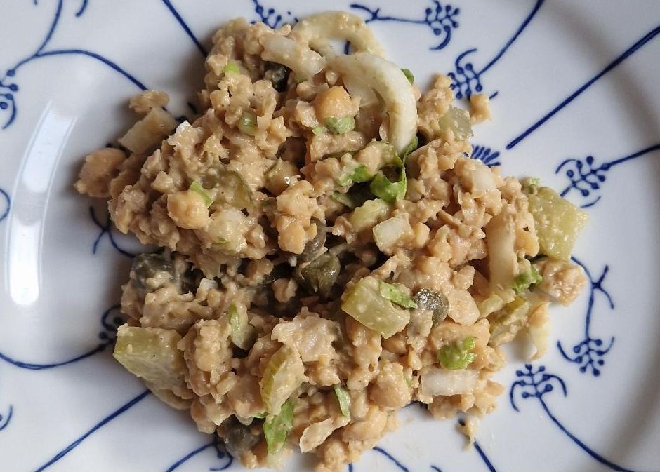 Zwiebeln, Stangensellerie und Gürkchen fein würfeln und mit den Kapern dazugeben. Alles miteinander vermischen und zum Schluss mit Salz und Pfeffer abschmecken.