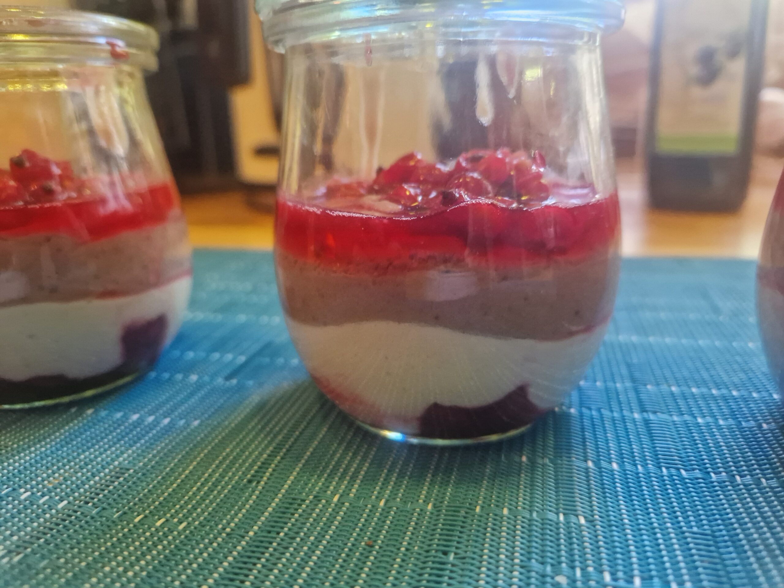 Den Seidentofu in ein hohes Gefäß geben und pürieren, sodass er glatt wird, dann halbieren. Falls gewünscht, einen Esslöffel Rum hinzugeben und mit pürieren. Die Schokoladen jeweils einzeln in einem Wasserbad schmelzen und dann jeweils mit der Hälfte des Seidentofus weiterverarbeiten. Nach Bedarf hier noch etwas Zucker hinzugeben. Die beiden Cremes aufeinanderschichten und mit Obst dekorieren.