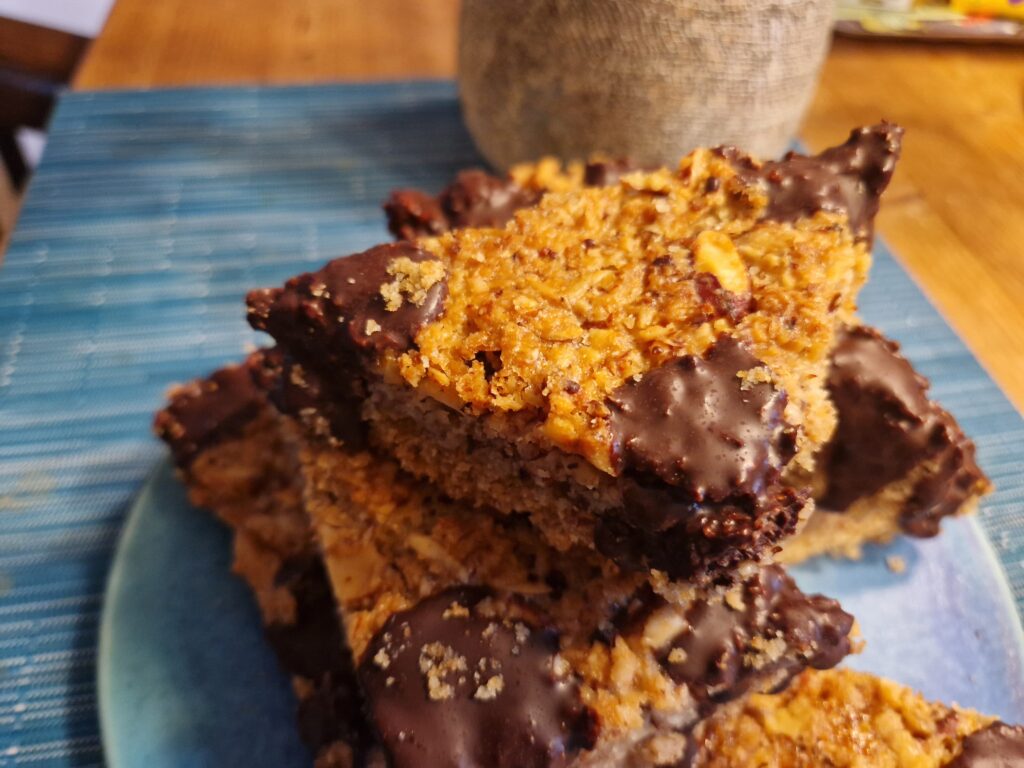 Die Zutaten für den Teig gründlich verrühren. Die vegane Butter sollte dabei weich sein. Ein Backblech mit (Dauer)backfolie auslegen und den Teig darauf geben, mit den Händen schön gleichmäßig festdrücken, sodass eine Unterlage entsteht. Mit dem Teigschaber eine schöne Schicht Marmelade darauf verteilen. Die Zutaten für das Nuss-Topping in einem Topf erwärmen und schön gründlich verrühren, dann auf die Unterlage geben und gleichmäßig verteilen. Im Backofen bei 180 Grad eine halbe Stunde backen. Am besten über Nacht auskühlen lassen und am nächsten Tag in Streifen > Vierecke > Dreiecke schneiden. Die Schokolade im Wasserbad schmelzen und mit einem Esslöffel über die Ecken laufen lassen, trocknen lassen, aufessen!