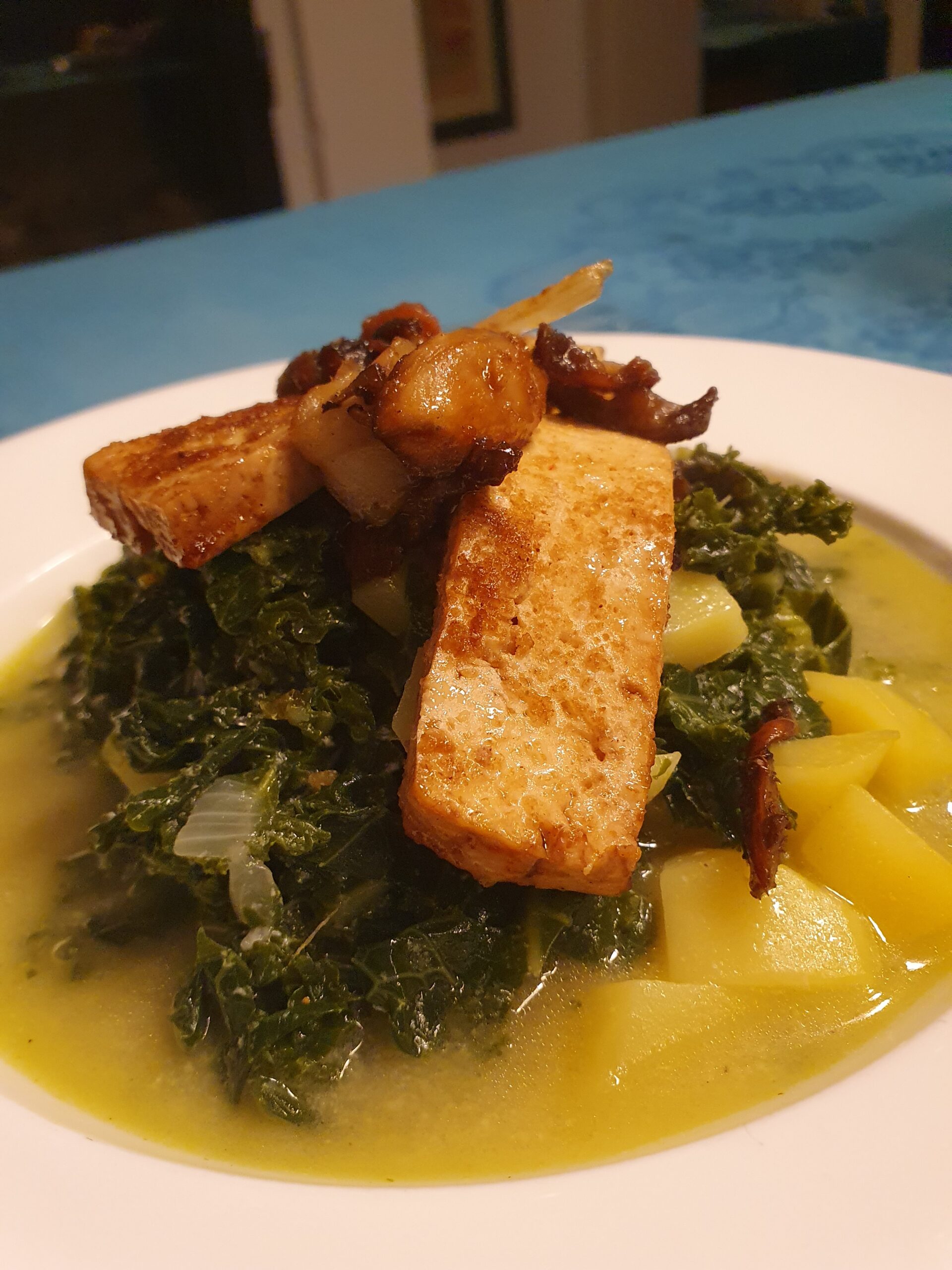 Dieses etwas seltsam anmutende Rezept ist eine wirklich gelungene Mischung aus asiatisch und Hausmannskost. Dazu eine der beiden Zwiebeln mit gequetschtem Knoblauch und geriebenem Ingwer vorsichtig anbraten. Währenddessen Grünkohl 5 Minuten blanchieren, auf die Zwiebel etc. geben, Brühe und Kokosmilch, Kartoffeln gewürfelt dazu und eine halbe Stunde köcheln lassen. Parallel dazu das Topping zubereiten: Austernpilze kleinschneiden und mit einer Zwiebel anbraten. Für den Tofu eine stark gewürzte Marinade zubereiten aus Sojasoße, Chutney, Senf, Tomatenmark und Gewürzen nach Vorliebe; Tofu hineingeben und etwas ziehen lassen, dann zu den Pilzen geben und etwas anbraten, Marinade daraufgeben und eindampfen lassen. Das Gemüse mit etwas Zimt und Chili würzen und das Topping darauf anrichten- fertig ist ein wärmendes, gesundes und proteinreiches Winteressen!