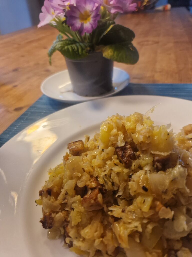 Vegane Butter in einem größeren Topf erwärmen, die gewürfelten Zwiebeln darin vorsichtig andünsten und die Knoblauchzehe dazu quetschen, mit dünsten. Den Kohl dazu geben und gründlich anbraten, dabei immer umrühren. Zerdrückte Kartoffeln hinzufügen, salzen und pfeffern.