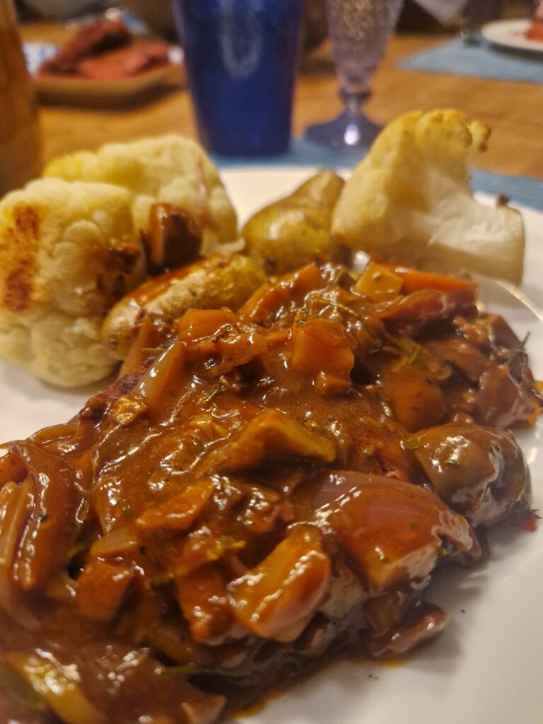 - 2 vegane Steaks als Fertigprodukt (wir haben die von Planted genommen, sehr empfehlenswert!), oder Soja Big Steaks /Chunks für Gulasch (letztere in Brühe vorgekocht)