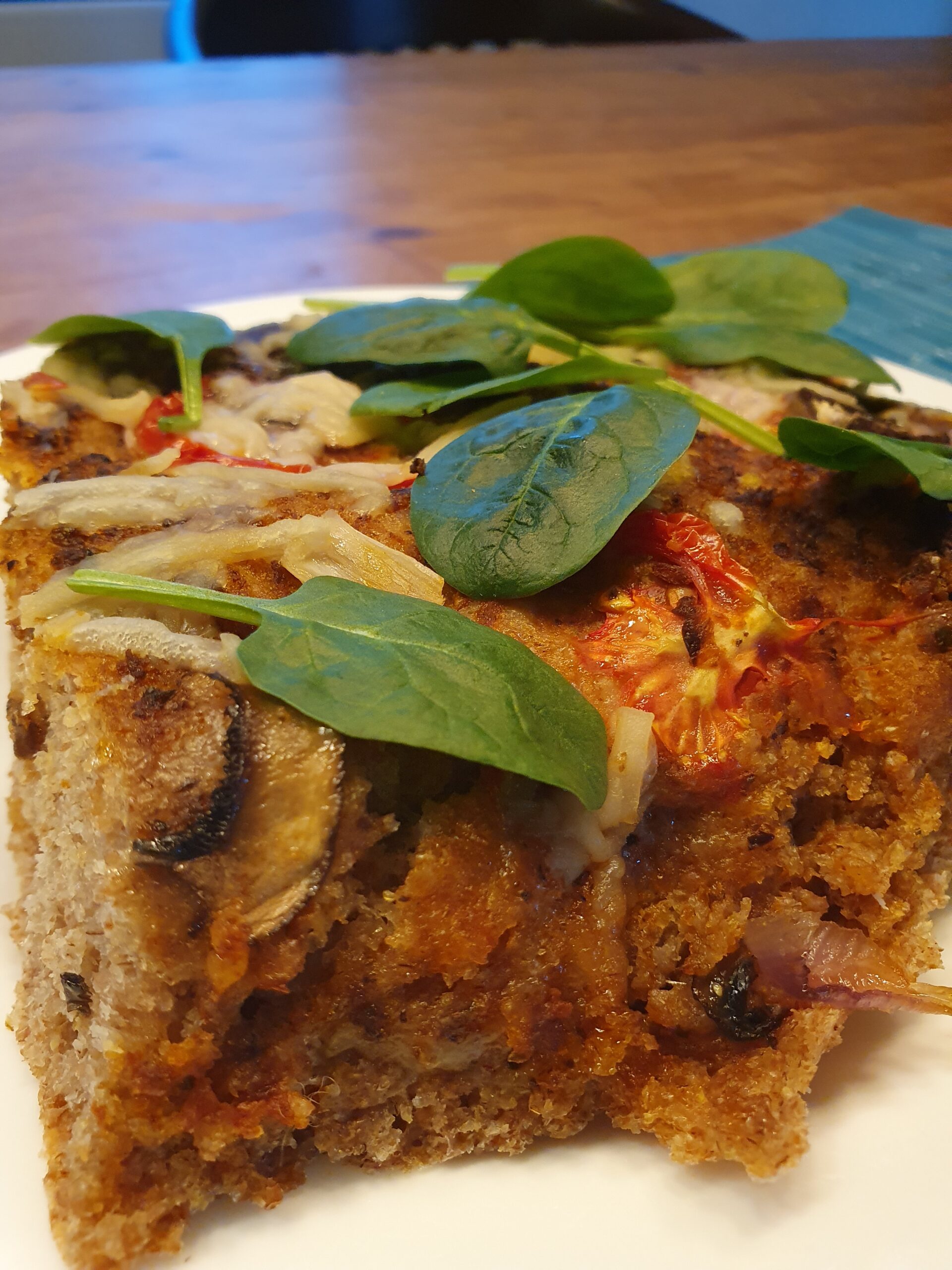 2 Teelöffel Salz - Belag nach Belieben (in meinem Fall Tomaten-Aufstrich als Grundlage, Pilze, einige regionale (teuer, aber gibt es!) Tomaten und Babyspinat sowie veganer Reibekäse