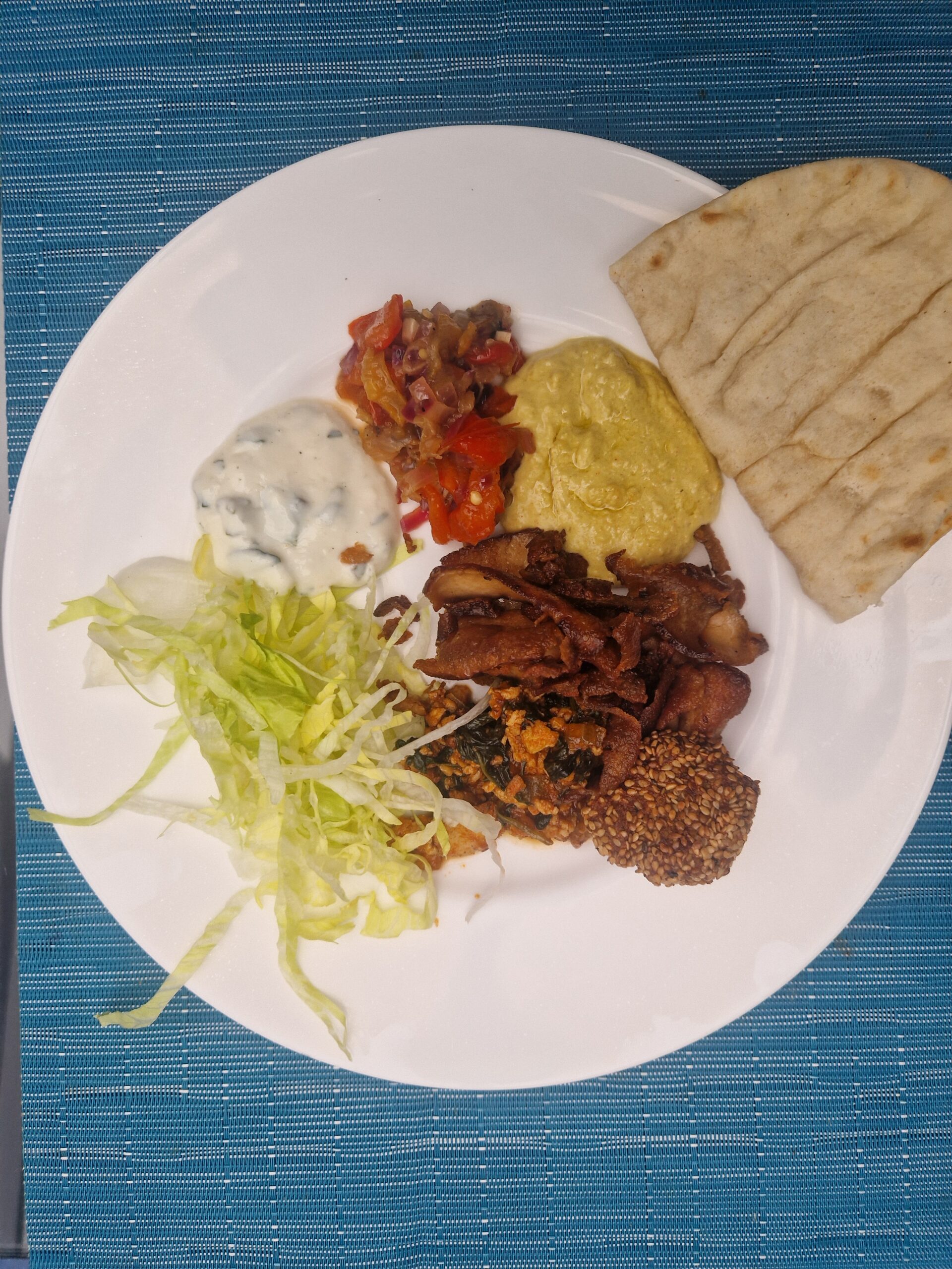 Der Hummus ist auf dem Bild auf 1 Uhr zu finden. Ich finde ihn außergewöhnlich lecker und cremig.