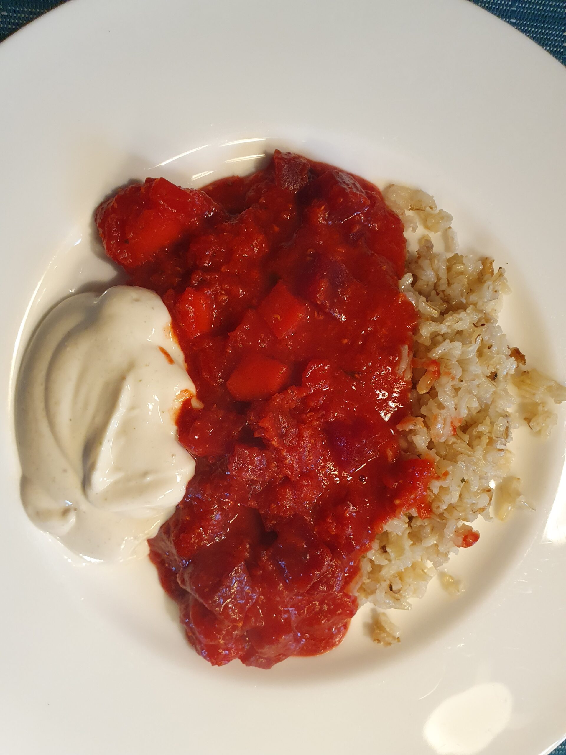 Zwiebel, Knoblauch, schälen und in kleine Würfel schneiden; Rote Bete schälen und in etwas größere Würfel schneiden. Im Topf etwas Öl erhitzen und Zwiebeln vorsichtig anbraten, Knoblauch hinzufügen und vorsichtig mitbraten. Dann Linsen und Rote Bete-Würfel hinzufügen und mit andünsten; Ingwer (in kleine Stücke geschnitten) und Chili sowie die anderen Gewürze nach eigenem Geschmack zugeben. Den Apfel mit andünsten. Mit Kokosmilch und Gemüsebrühe ablöschen und ca. 15 Minuten kochen – fertig! Ich habe dazu einen Dip aus Sojaquark, sehr fein gewürfelten sauren Gurken, Gewürzen und Vollkornreis gemacht.