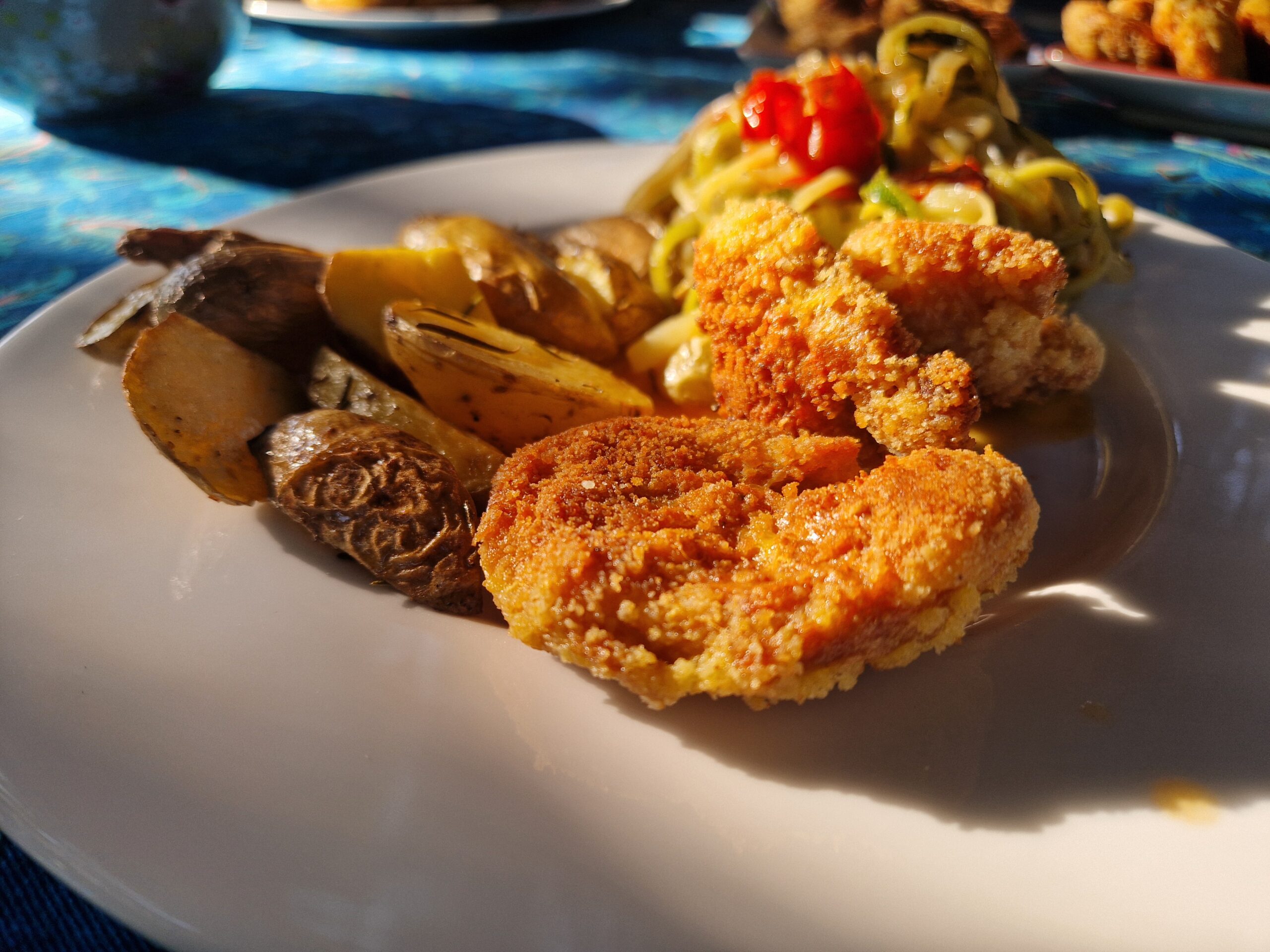 Die Schnitzel gab es bei uns mit Zucchinigemüse aus dem Garten und Backofenkartoffeln mit Rosmarin. War lecker!