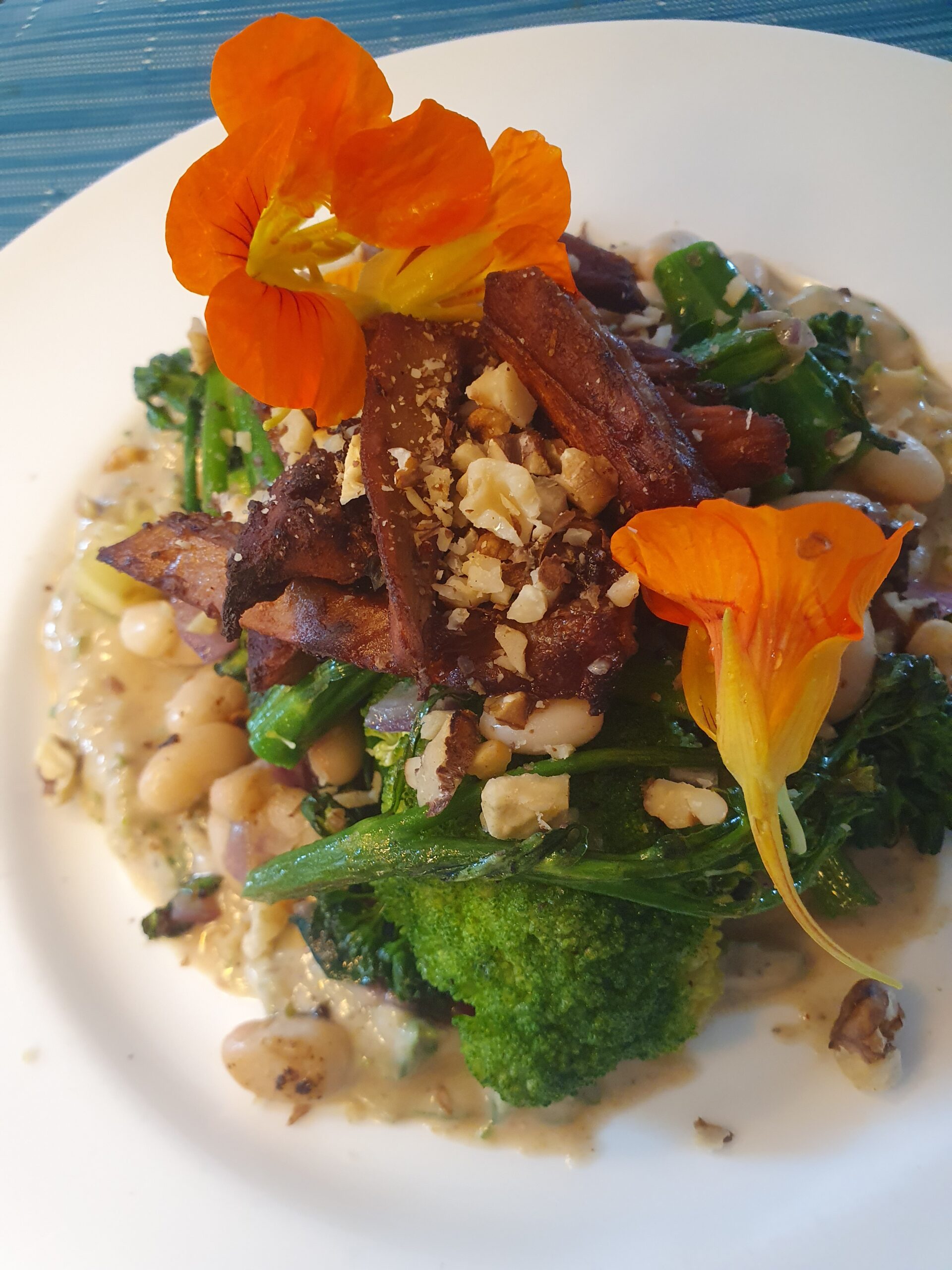 - Zum Servieren das Dressing auf dem Teller verstreichen und die Brokkoli-Mischung darauf verteilen. Mit den gerösteten Nüssen bestreuen.