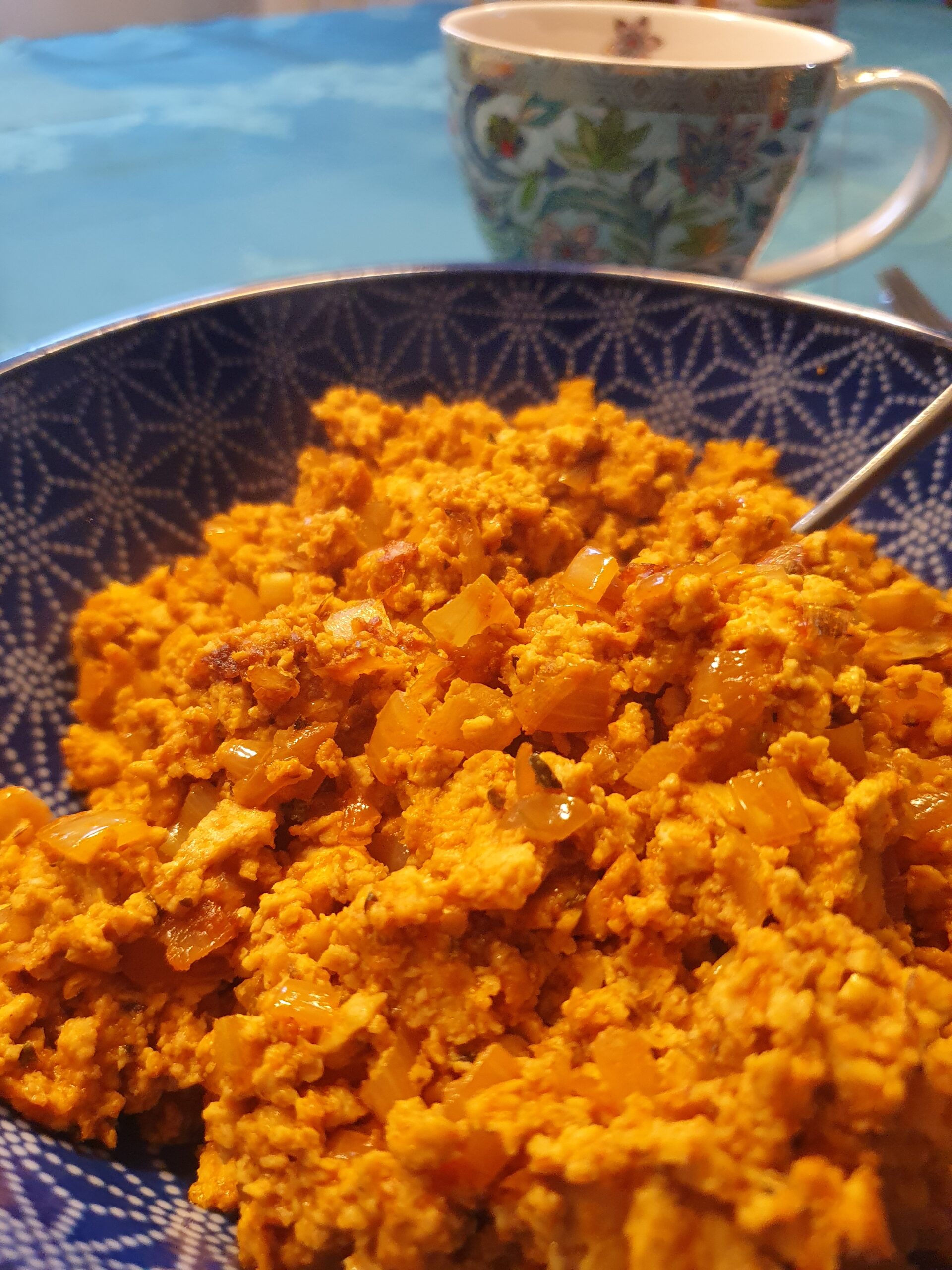 Die Zwiebel(n) würfeln und in etwas Bratfett vorsichtig glasig anbraten. Den Tofu derweil aus der Packung nehmen, die Flüssigkeit ablaufen lassen und mit einer Gabel auf einem Teller zu kleinen Krümeln zerdrücken. Mit Sojasoße und den anderen Gewürzen nach eigenem Geschmack würzen, zu den Zwiebeln geben und ca. 10 Minuten braten, dabei immer gut wenden – fertig!