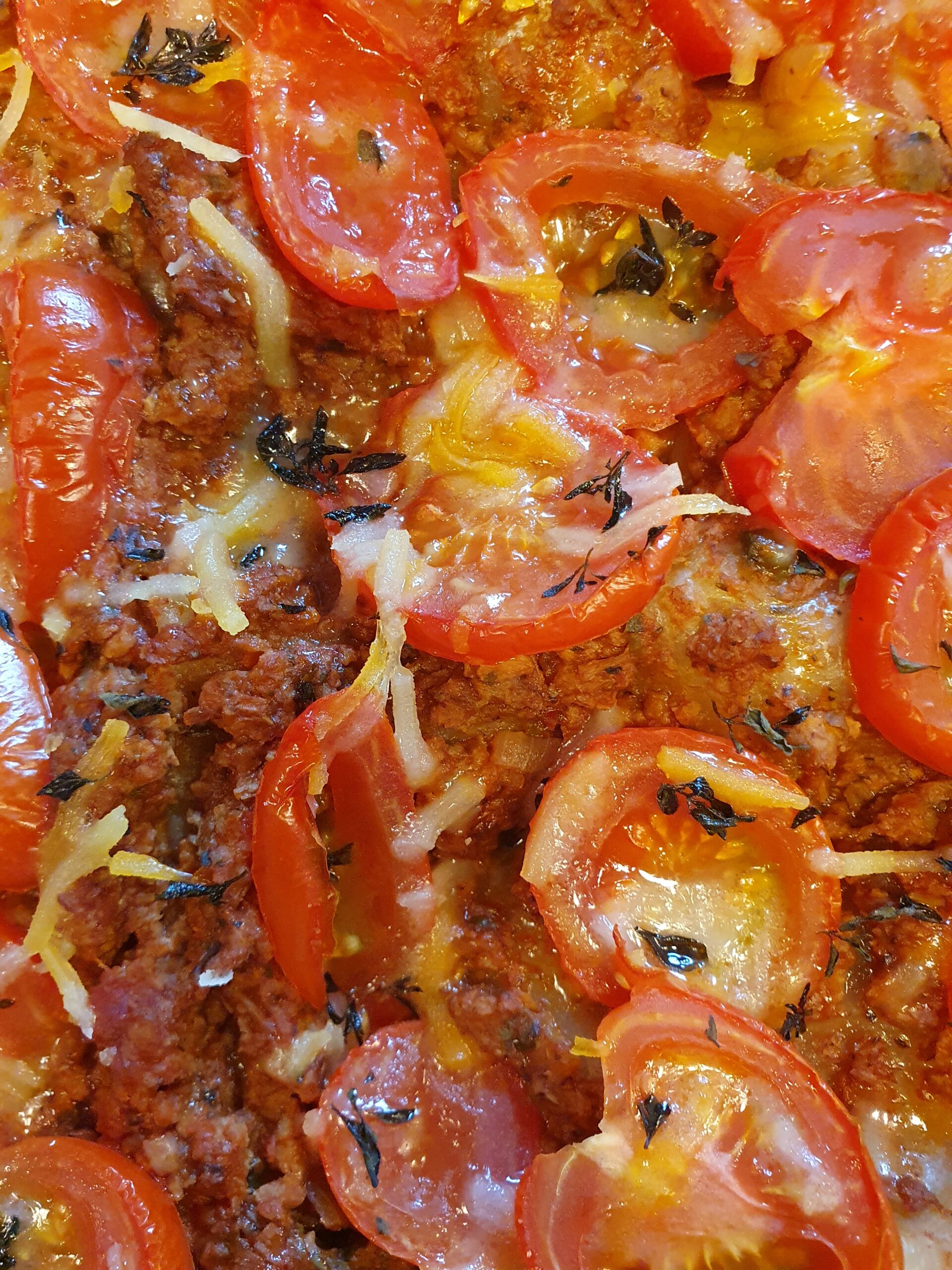 Veganes Hack braten, gewürfelte Zwiebeln und Knoblauch (gepresst) hinzugeben und mitbraten. Mit Salz und Pfeffer oder Chili würzen, sodass eine schöne würzige Masse entsteht. Alternativ mit dem Sojagranulat folgendermaßen umgehen: Eine stark gewürzte Brühe herstellen aus heißem Wasser, Brühe, Sojasoße, Chutney, Chili, Zwiebelpulver,… etc. und nach eigenem Geschmack. Es sind viele Möglichkeiten denkbar, wie man die würzige Brühe genau herstellt. Darin Sojagranulat einstreuen, bis die Menge von Flüssigkeit und Granulat so passt, dass das Granulat ausreichend Flüssigkeit aufsaugen kann. Ich koche dann das Ganze, weil ich festgestellt habe, dass es so besser verdaulich ist. Dann wandert es ohne Fett in die Pfanne und wird eingedampft; Zwiebeln, Knoblauch und Fett dazu (wie oben) und dann so kross wie möglich unter häufigem Rühren anbraten. Nun zur jeweiligen Variante an Hack 100 ml Rotwein hinzugeben, sodass der Alkohol verdampft. Die Kapern abgießen und klein hacken, Tomatenmark und Kräuter und Gewürze hinzugeben, sodass eine leckere Hackvleischmasse entsteht. Nun die Bechamelsoße herstellen. Dazu die vegane Margarine im Topf schmelzen; Mehl hinzugeben und etwas einköcheln lassen. Unter Rühren Pflanzenmilch hinzugeben, sodass eine nicht zu dickflüssige Masse entsteht. Diese mit Salz, Pfeffer und Muskat abschmecken. Nun in die Auflaufform zuunterst etwas pflanzliche Milch gießen, sodass der Boden bedeckt ist. Darauf die ersten Lasagneblätter legen. Abwechselnd Hack, Bechamel und Lasagneblätter schichten. Zum Schluss obenauf die frischen Tomaten in Scheiben geschnitten auf der Oberfläche der Lasagne verteilen und mit frischen Kräutern wie Oregano bestreuseln. Optional noch etwas veganen Reibekäse darauf geben. Bei 180 Grad im Ofen für ca. eine halbe Stunde backen. Man kann zum Schluss die Temperatur auch nochmal steigern, sodass die Oberfläche etwas knusprig wird. Wenn die Lasagneblätter mit einer Gabel gut durchstochen werden können, ist die Lasagne fertig. Das passt dazu: Ein frischer Salat.