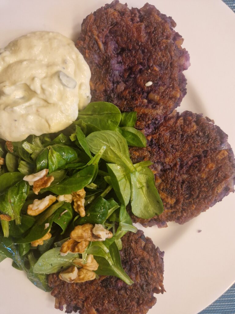 Dieses Rezept habe ich vom Rewe-Newsletter ausgehend veganisiert. Ging super! Es ist mal eine ganz neue Art, Rotkohl zu essen und es waren sozusagen super leckere Kartoffelpuffer plus!