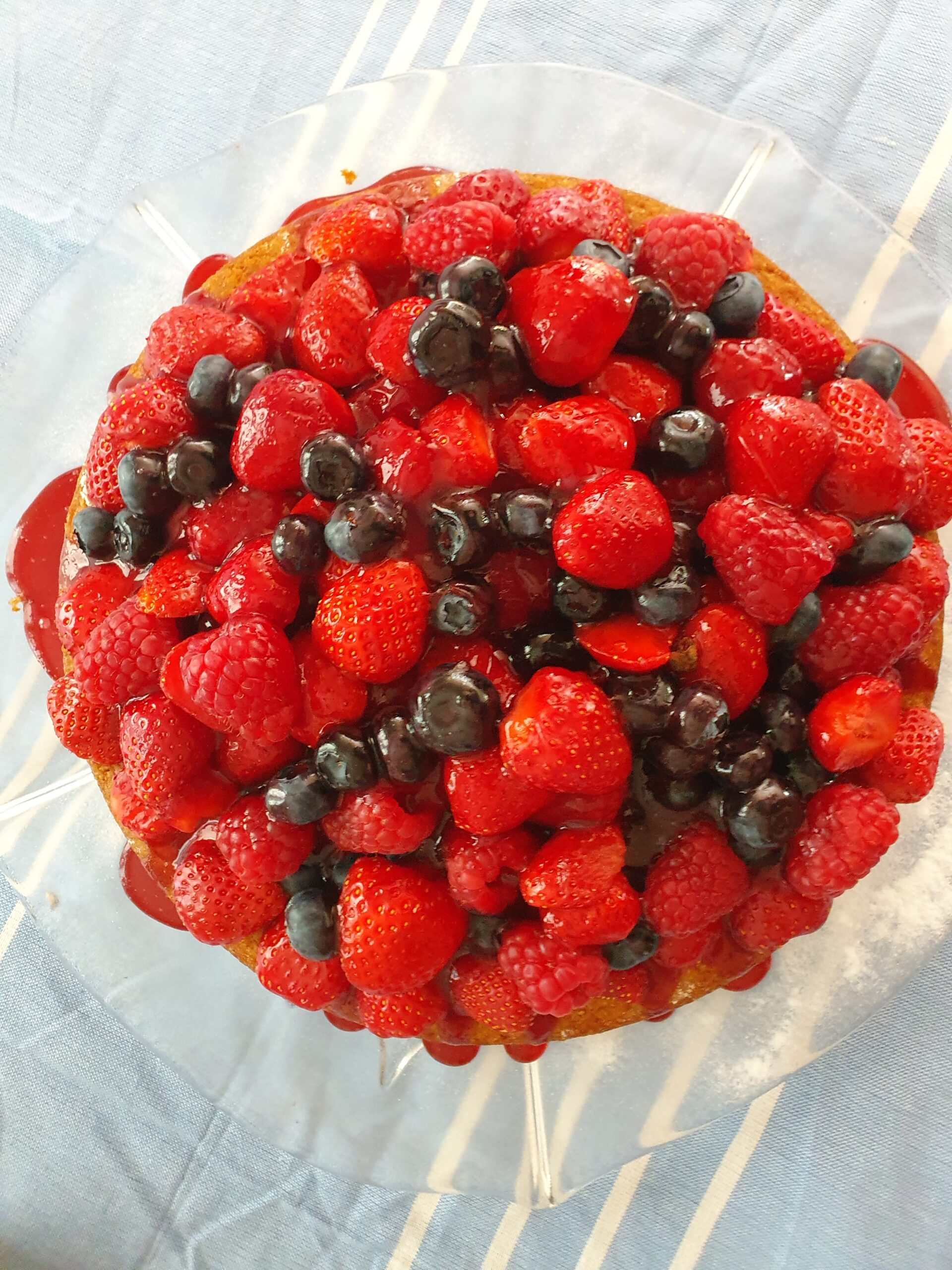 Ofen auf 180 Grad vorheizen. Alle trockenen Zutaten mischen, gut verrühren, dann die die Flüssigkeiten hinzugeben. Es entsteht ein sehr flüssiger Teig. Diesen in eine mit Backpapier ausgelegte Backform geben und 35-40 Minuten backen. Gut auskühlen lassen. Sahnesteif auf den ausgekühlten Boden streuen (damit das Obst nicht durchnässt). Das Obst nach dem Waschen gut abtrocknen lassen auf einem Geschirrtuch. Aufhäufen und mit Tortenguss nach Anleitung bedecken.